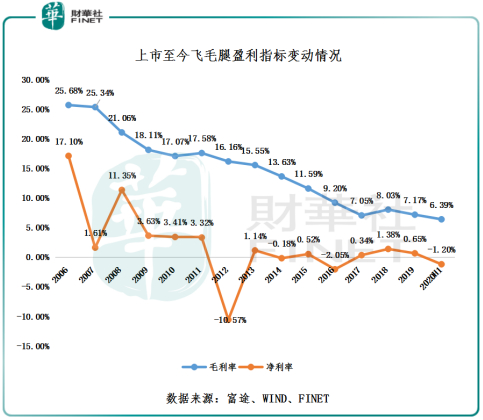 盈利指标方面,近些年我国手机锂电池行业内部竞争激烈,行业竞争对手众多,产品竞争力大抵相当,叠加行业增长放缓,整体市场成长空间有限,而不少企业为追求规模经济的利益,不惜扩大生产规模,导致产品大量过剩,企业之间开始削价竞销,利润空间被一压再压。在此形势之下,高度依赖手机锂电池的飞毛腿,毛利率如泄了闸的洪水倾盆而下,根本没有停下势头。截至2006年底至2020年中期,飞毛腿的毛利率从25.68%下滑至6.39%,屡创新低。如下图所示,在毛利率的持续下行的形势下,人工成本及原材料成本的上行,最终压垮飞毛腿净利率空间。