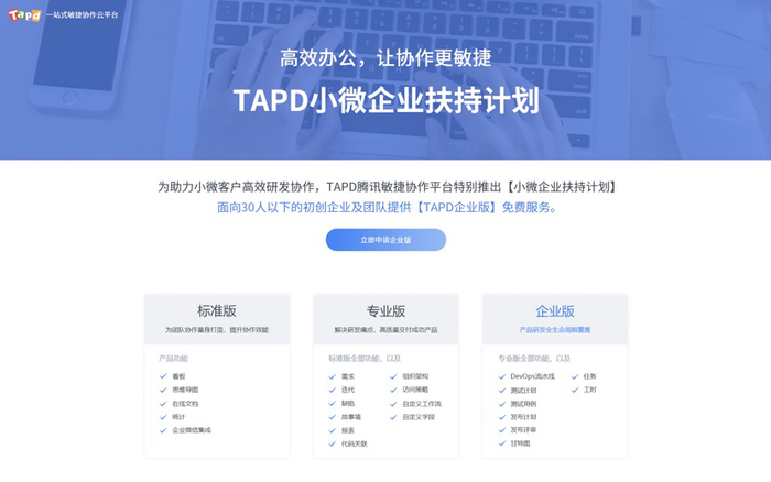 在疫情期间,许多小微企业因数字化程度较低受到了更严重的冲击,甚至经营也陷入了困境。对此,TAPD特别推出了小微企业扶持计划,面向30人以下的初创企业及团队,提供免费的TAPD企业版服务。