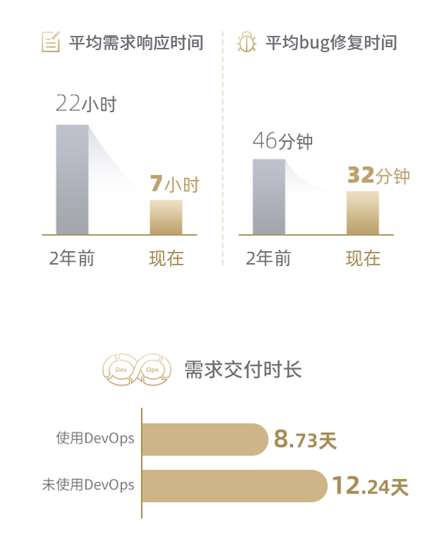 报告数据显示,使用TAPD后,企业单个需求平均响应效率提升了67%,平均Bug修复时长缩短了1/3,通过DevOps流程优化 ,需求交付时长平均减少3天半,研发效能显著提升。