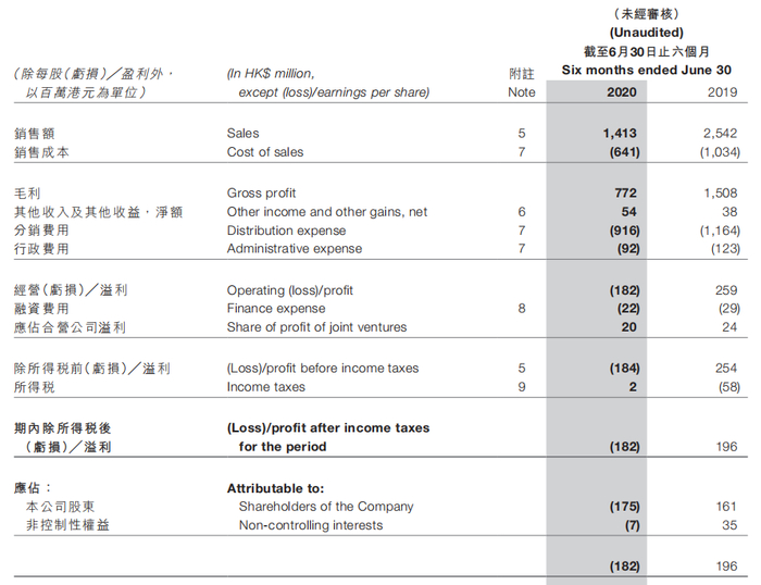 9月4日,资本邦获悉,港股公司佐丹奴国际(00709.HK)发布2020年上半年业绩公告称,今年上半年集团销售额下降44.4%至14.13亿港元,毛利率为54.6%,去年同期为59.3%;集团于期内录得经营亏损1.82亿港元,其中仅香港特区已占1.05亿港元;股东应占亏损约1.75亿港元,去年同期录得利润1.61亿港元,亏损同比增加了208%。
