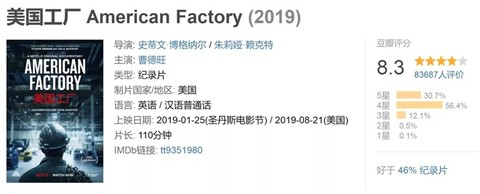 这部由美国前总统奥巴马投资制作的纪录片,跟拍四年半,千分之一的素材比,展示出的工会问题、中美文化差异等问题引发了大众的深思。在烂番茄上有着96%的新鲜度,在豆瓣评分8.3分,超过8万的网友评价。