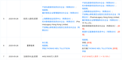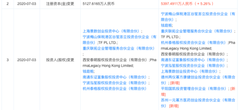5月26日、7月3日澎立生物发生多次工商信息变更,投资人变更中新增4位机构股东(见下图),另外公司注册资本也由2019年的4250.2700万人民币5月26日增加到4452.9300万人民币,7月3日达5127.6165万人民币。
