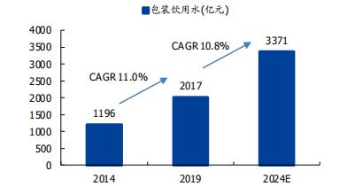 就包装水而言,纵向看,在中国包装水行业近四十年的发展史,1980初-1990初为起步阶段,CAGR约40%;1995-2005年进入大流通时代,CAGR 27.4%;2005-2015年为品牌化规模化发展阶段,CAGR约为14%;2015年以后,也就是现如今,进入高端化健康化发展阶段,CAGR约为11%。根据弗若斯特沙利文的判断,2019-2024 年中国包装饮用水行业仍将保持10.8%的复合增长,并于2024 年市场规模达到 3371亿元。