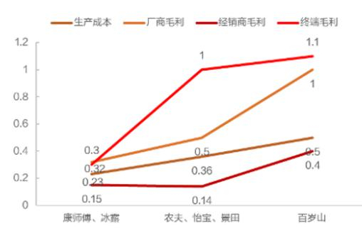 而包装饮用水的高毛利,主要是因为其销量最大的大众产品“2元水”的中高端卡位比较特殊:同定位的怡宝“纯净水”概念不如矿泉水受欢迎;稍高端的“3元水”百岁山则受制于供应规模和市场培育。