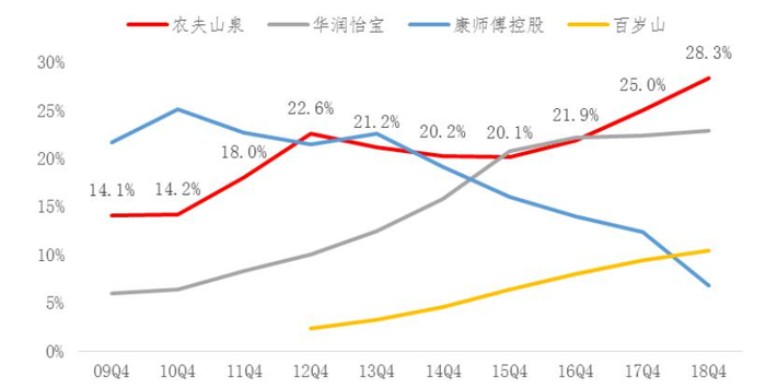 农夫 2015 年以来市占率持续提升,近年来,消费者的 品牌意识增强,农夫依靠较强的品牌拉力,逐渐跟以渠道见长的怡宝在市场份额上 拉开差距,2017-2019 年怡宝的营收规模徘徊在百亿附近,而农夫山泉的包装水收 入规模从 101 亿元提升到 143 亿元,根据尼尔森数据(见下图),农夫山泉在包装水行业的市 占率从 20%(2015 年)提升至 28%(2019 年)。换句话说,在包装水领域,隐隐有双寡头向单寡头格局演变的态势。
