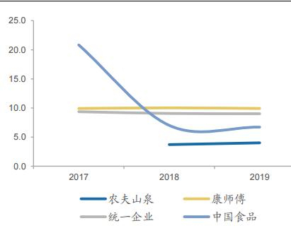 除瓶装水外,农夫山泉还有15款产品,涵盖茶饮、功能饮料和果汁等,19年的总销售额达97亿。考虑到农夫山泉的东方树叶在无糖茶领域具备一定的领先优势,受益茶饮消费低糖 化的趋势,市占率仍有提升空间。
