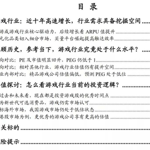综上,我们认为,当前时间点是非常好的投资中国游戏行业的机会。主要逻辑分为3点:1)我国游戏行业中的精品游戏公司仍处于高速增长阶段,对于预测PE有较大提升空间,PEG处于低估状态;2)对标海外市场,目前我国游戏行业收入稳定性已逐步被证明,具有长期的投资价值,具有核心游戏护城河的公司市值仍有较大成长空间。3)游戏作为可选消费品的价值暂未受到市场的广泛认可,其估值会伴随市场接受度提高得到提升。