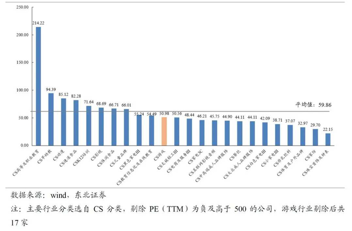 从不同行业的PE(TTM,算数平均值)横向对比来看,游戏行业目前平均PE估值为50.98倍,低于整体行业均值的60.14倍。与其他行业相比也处于偏低的位置,仅高于10个行业,低于18个行业。其PE与倍数石油化工、轻工制造、纺织服装等行业相近。