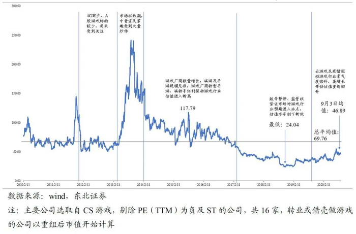 从A股的游戏行业整体估值水平看,也经历了震荡的过程。在早期阶段,由于A股上市游戏公司较少,整体估值偏高。2013-2014年是市场的狂热期,且由于游戏标的公司较少,平均估值推至200倍+,随后便快速恢复至100倍左右。2014年开始,A股不断有游戏公司开始借壳上市,或由其它行业公司转业,游戏公司数量出现显著增长。随后由于手游兴起,端转手红利驱动游戏行业估值提升,最高于2015年达到117.79倍PE(TTM)。