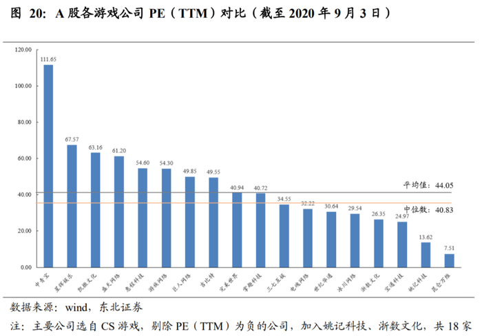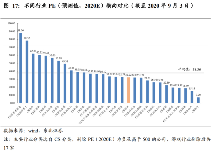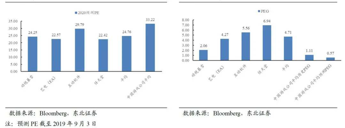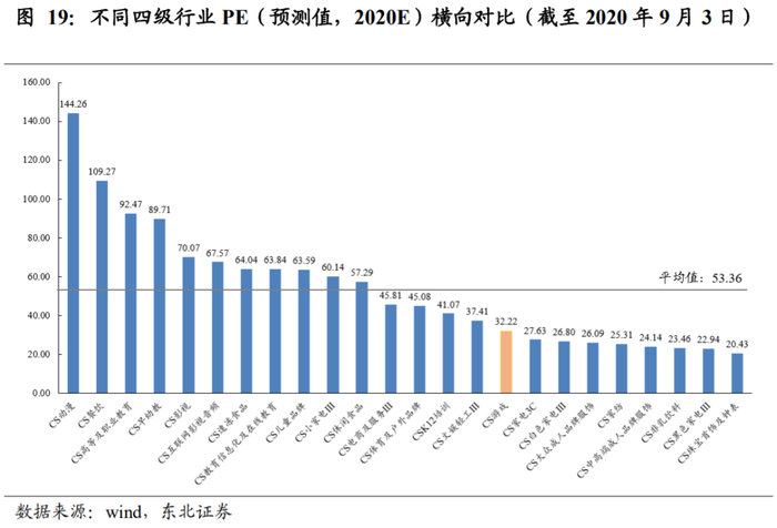 再从预测PE(2020E)看,游戏行业整体估值仍然偏低,游戏行业平均预测PE为33.22倍,低于平均值的38.36,与综合金融、汽车、商贸零售、农林牧渔、轻工制造相近。但我们认为,游戏相较于这些行业,往往具有更高的增长能力,应该享有更高的估值。
