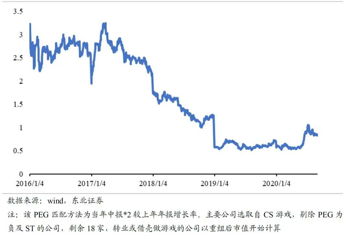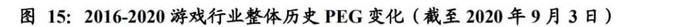 从游戏行业整体的历史PEG看(其中PEG匹配方法为当年中报*2较上年年报增长率,PE TTM 计算方式为当前总市值除以前面四个季度的总净利润),从2016-2017年为2.5-3倍,伴随监管变严逐渐降低,2019年1月-2020年5月均处于0.5-0.6的绝对低位,尽管彼时游戏行业PE存在着一定的上升,但2019年游戏行业公司增长率也较高,造成整体PEG仍处于偏低位。2020年6月开始PEG持续提升,于7月达到短期内高点。目前游戏行业历史PEG处于低位,我们认为未来PEG相较历史具有修复空间。