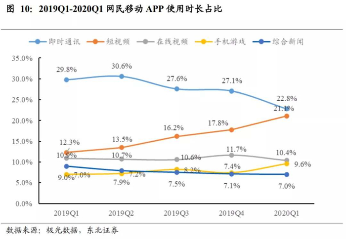 从2019年Q1以来,以抖音、快手为首的短视频平台对移动端用户流量占据时长持续增加,截至2020Q1,其占比已达21.1%,仅次于即时通讯产品。伴随着抖音及快手的强势崛起,这类APP也逐渐成为庞大游戏买量平台,游戏公司也更喜爱在用户标签更为明确的平台中买量。