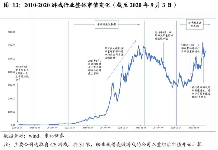 2014年6月,游族成功借壳逐渐开启了游戏公司借壳上市潮,后续三七、完美、巨人等大量游戏公司纷纷借壳上市。此后,伴随着用户基数+ARPU值的双重增长,游戏行业市值增长进入快车道,到2017年1月达到短期内的顶峰,超过5500亿元。