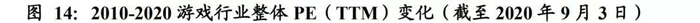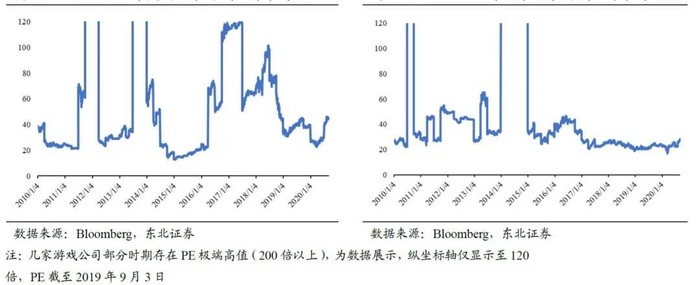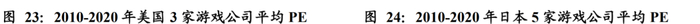 为了对标海外市场,我们选取具有代表性的3家美国上市游戏公司(动视暴雪、EA、Take-Two互动软件)共同构成美国游戏股票池。同时选取5家具有代表性的日本上市游戏公司(任天堂、万代南梦宫、CAPCOM、Square Enix、Konami)构成日本游戏股票池,拉取其2010年1月4日至2020年9月3日PE,取平均值后观察。可以发现无论美国还是日本,其游戏股均PE经历过高低波动,最终分别稳定在40-50倍及25-30倍之间,在部分净利润表现较差的时期,其PE与往年值并不匹配,因此整体市值仍处于波动上涨状态(18-19年有所下调)。这一方面反应了海外市场本身对游戏股的高度认可,游戏股本身具有长期投资的价值,也反应了游戏股经过高增长后,最终PE会回归稳态。