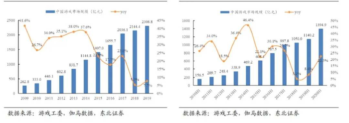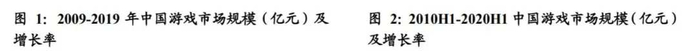 我国游戏市场规模近十年来经历了高速发展期,从2009年的262.8亿逐渐发展至2019年的2308.8亿,10年复合增长率高达24.27%。尽管近几年由于规模基数不断提高,增长率降至个位数,但仍保持稳定增长。从半年度市场规模看,2020H1游戏市场规模因疫情原因,居民宅家娱乐盛行带来高增长,市场规模达到1394.9亿元,增长率高达22.3%。