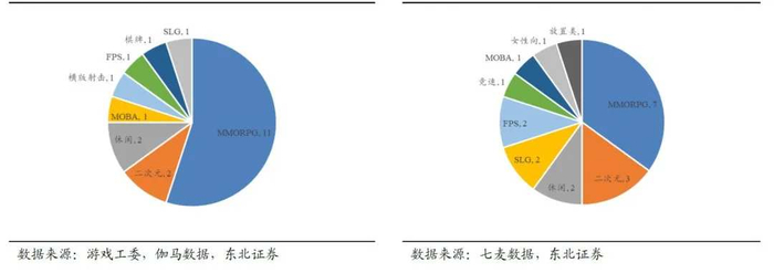 观察2020H1及2017Q1-Q3的Top20手游分布可以发现,曾经市场上占据最大比例的MMORPG品类占比已逐渐降低,从11款减少至7款,并且风格多元化,产生像《明日之后》这样的沙盒生存类MMO,SLG、二次元(卡牌+格斗)、FPS(吃鸡类计入FPS)类游戏占比均有所提升,说明在该品类的产品中,已经产生一定数量的满足玩家需求的游戏。