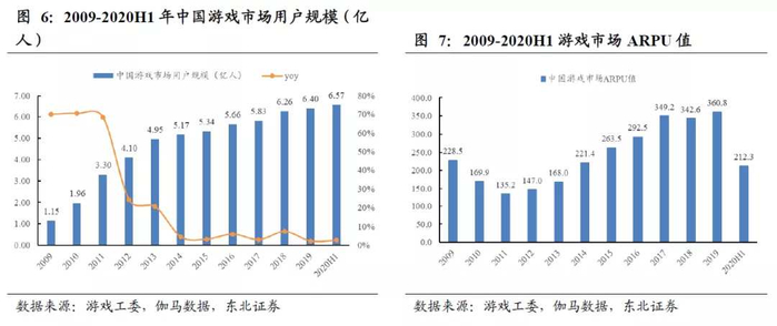 游戏玩家数增长趋缓,未来整体市场规模增长主要依靠ARPU值提升。从游戏市场用户规模看,在疫情影响下2020H1用户规模已达6.57亿人,短期内很难有较大提升,增长率持续维持在个位数。