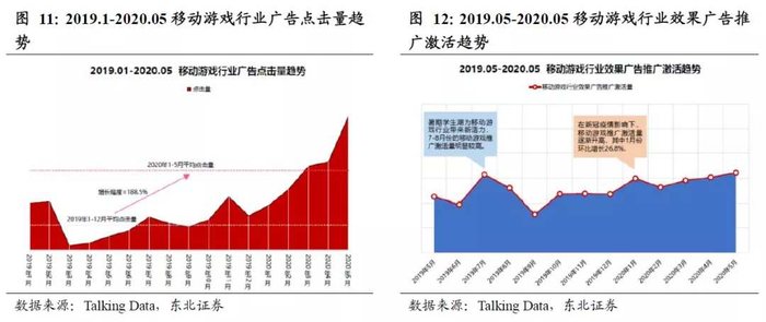 在短视频平台占据用户时长提升的情况下,疫情也起到了一定的正面作用,2020年1-5月平均手游广告点击量相比2019年1-12月点击量增长188.5%。精准的算法推送+更高质量的买量素材大大提升了买量效率,手游的广告点击趋势及激活趋势都不断攀升。