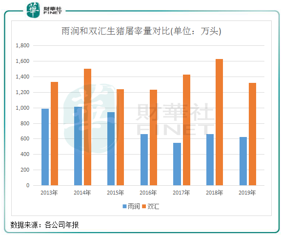 在祝义才遭强制措施后,一蹶不振的雨润迅速被双汇拉开距离。在关乎到屠宰企业销售端的冷鲜肉与冷冻肉及深加工肉产品方面,雨润过去几年在生猪屠宰量上不断被双汇大幅超越。2019年,双汇生猪屠宰量1320万头,同期雨润只有624万头,不及双汇的一半。