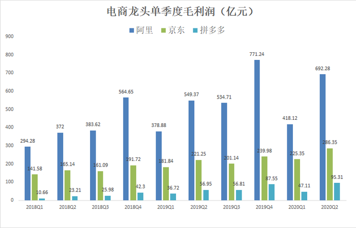 用户数量的扩张,同样为电商平台带来了广阔的业绩表现。考虑到京东是赚取差价的零售模式,而阿里、拼多多以电商服务平台收入为主,单纯用营收对比似乎有失公正。若按照毛利润比较,阿里巴巴目前仍然处于龙头地位,2020Q2的毛利润总额远超拼多多、京东的毛利润之和。