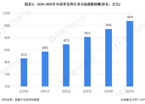 中国有悠久的茶文化历史,茶文化的历史积淀和消费观念的转变,使许多人都已经接受了茶饮料,说明中国已经有了很好的茶饮料消费基础。中国茶饮料的发展时间很短,市场开发集中在大中城市,而小城市和农村市场的开发尚处于起步阶段,未来发展前景广阔。2014-2019年,我国茶饮料市场规模从653亿元增长到787亿元,年复合增长率达到3.8%。预计未来几年我国茶饮料行业市场规模将以年复合增长率为3.5%的速度增长,到2025年,我国茶饮料行业市场规模将接近1000亿元。
