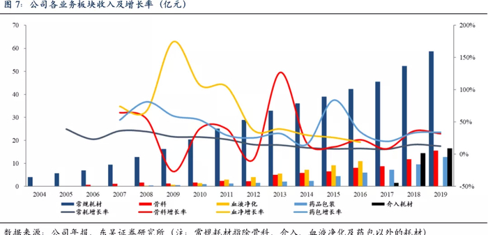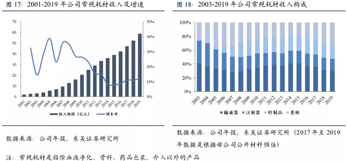 2004-2013年公司收入年均复合增长率达到31%,其中临床耗材增速26%以上,是公司增长的核心推动力。2013-2019年公司收入年均复合增速达到14%以上(扣除血液净化业务复合增速17%),其中常规耗材年均复合增速10%左右,骨科和药品包装业务年均复合增速分别为20.6%和30%。