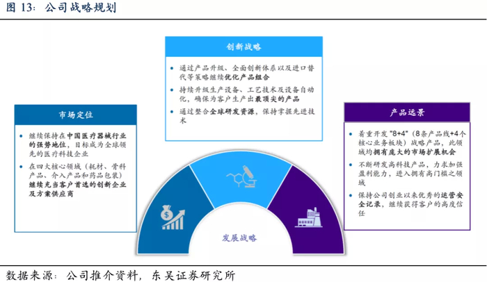 公司战略目标是成为中国领先的医疗器械整体解决方案供应商。市场定位:继续保持公司在中国医疗器械领域的强势领先地位,在四大核心领域通过产品创新持续占据主动地位以及继续提升国产替代力度。产品定位:重点开发“8+4”战略产品(8条产品线+4个核心业务板块),不断研发高科技产品提升盈利能力。创新战略:通过产品升级、全面创新体系以及进口替代等策略优化产品组合,通过整合全球研发资源,掌握全球技术发展方向。