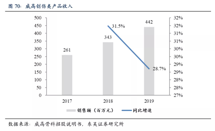 从竞争格局上看,2019年公司在国内创伤类市场份额为4.7%,排在强生、史赛克、大博医疗和美敦力之后。2019年公司创伤类产品收入为4.42亿元,同比增长28.7%,显著高于行业平均增速,市场份额有望持续提升。
