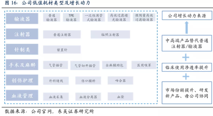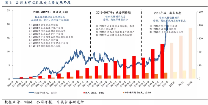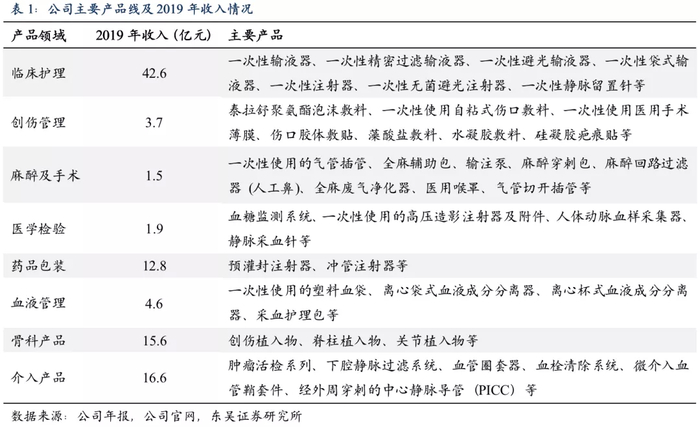 1)2004-2012年:核心业务快速成长,积极布局新业务。以输液器和注射器为核心产品,2001年输液器+注射器合计占据公司近80%的收入。2004年上市以后,公司进入快速增长期,临床常规耗材类型持续丰富,是公司主要的增长点;并积极拓展血液净化、骨科耗材、心血管耗材等领域。