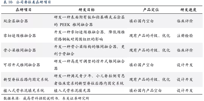 为了维持脊柱产品在国内市场的竞争地位,同时缩小与国外厂商的差距,公司高度重视产品创新。公司在研项目中,既有对现有产品的升级和优化,也有自主创新以弥补国内市场的空白,打破进口垄断。未来随着公司研发成果的不断落地,脊柱线产品将不断推陈出新,保持并提升公司市场竞争力,加速追赶外资龙头企业。