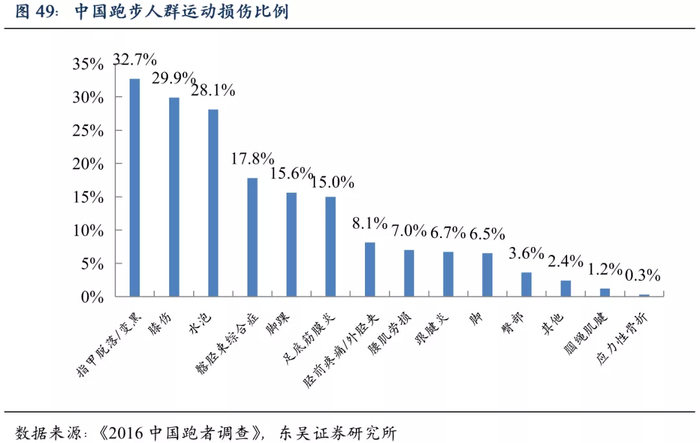 另外,骨科疾病的人群也逐渐年轻化,低头看手机和久坐的习惯对颈椎和腰椎造成压力,一定程度上促进了骨科疾病的高发。健康意识和运动普及加速催生各类运动损伤。以跑步为例,《2016中国跑者调查》显示跑步人群中各类运动损伤的比例高达81%,伤病种类在14种左右,其中多数为骨科疾病。