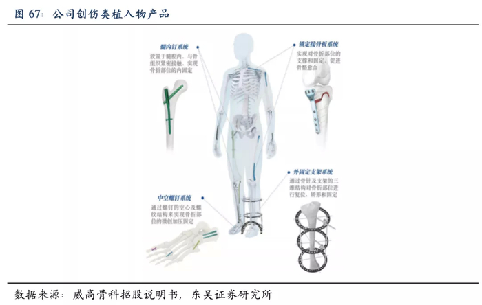 公司创伤类产品主要由锁定接骨板系统、髓内钉系统、中空螺钉系统、外固定系统组成,主要用于四肢、肋骨、手指、足踝、骨盆等部位的骨折及矫形固定。