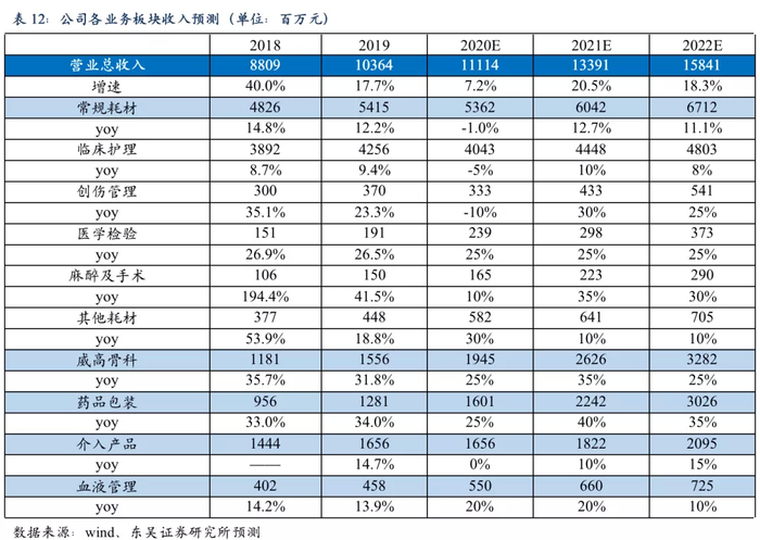 常规耗材:受卫生事件影响,预计2020年收入增速下滑1%左右,2021年、2020年预计恢复13%、11%左右的增速;