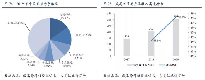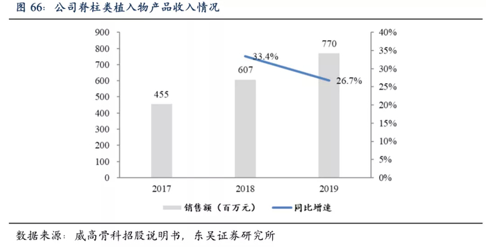 公司关节产品起步于2007年, 2017年收购海星医疗后,关节类技术实力大幅提升,产品线得到了显著完善。2019年公司关节类产品实现收入3.04亿,连续两年实现了高速增长。公司2019年市场份额仅为3.5%,我们认为随着公司关节实力的持续提升,依托公司强大的骨科销售渠道,关节市占率有望持续提升。