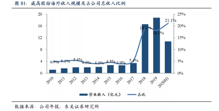 威高股份在收购爱朗医疗之前,海外收入占公司整体收入比例多年维持在5%左右,2018年收购爱琅后,海外收入占比显著提升至近19%,2020年上半年收入规模占比提升至21%。