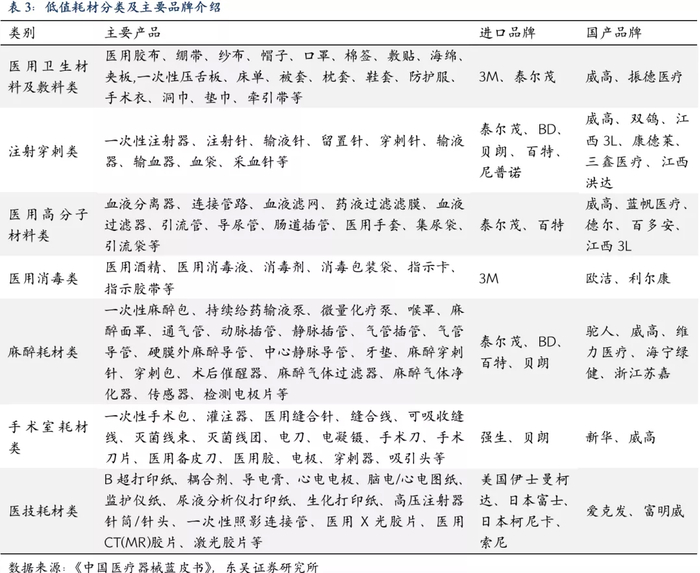 根据用途不同,低值医用耗材可以分为医用卫生材料及敷料类、注射穿刺类、医用高分子材料类、医用消毒类、麻醉耗材类、手术室耗材类、医技耗材类等。