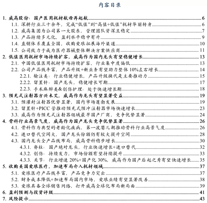 我们认为,公司为国内医用耗材航母级平台企业,留置针、输液器、注射器等常规耗材市占率领先,预灌封注射器、骨科产品已为市场龙头,公司业绩稳健增长的确定性强。随着骨科、药品包装、介入耗材快速发展,公司有望进入新的增长阶段。首次覆盖,给予“买入”评级。