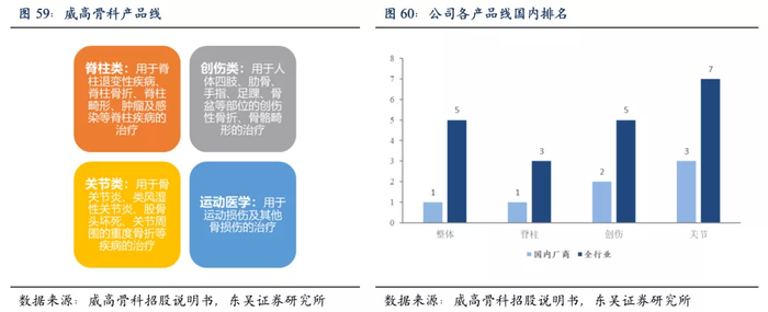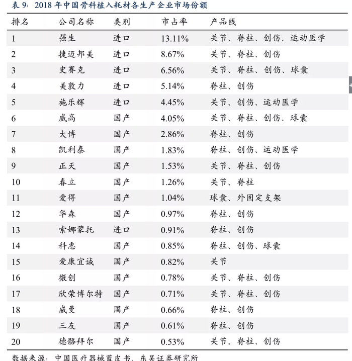 公司是国产脊柱龙头,创伤与关节产品处于国产前三。2019年公司在骨科领域市场份额位居国内厂商第一,全行业第五。其中,脊柱类产品市场份额位居国内厂商第一、全行业第三;创伤类产品市场份额位居国内厂商第二、全行业第五;关节类产品市场份额位居国内厂商第三、全行业第七。
