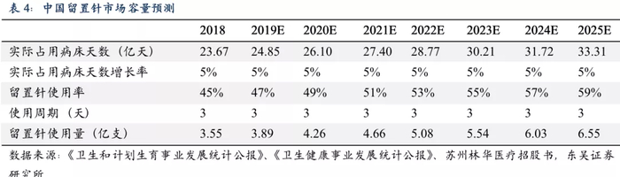 根据《卫生和计划生育事业发展统计公报》、《卫生健康事业发展统计公报》,2018年我国实际占用病床天数约23.67亿天,2010-2018年均复合增长率为5.97%。2015年留置针在重庆市二级、三级医院的的平均使用率分别为51.31%、63.30%,但考虑到在低级别医院的平均使用率较低,预计留置针总体使用率在45%,而欧美等发达国家的留置针使用率已达95%以上。留置针作为一次性输液产品的适用时间不大于72小时。谨慎起见,我们假设2018-2024年实际占用病床天数的年均复合增长率为5%,留置针使用率按每年2%增长,留置针使用天数为3天,预计至2025年留置针的使用量可达6.55亿支,2018-2025年CAGR为9.14%。