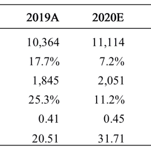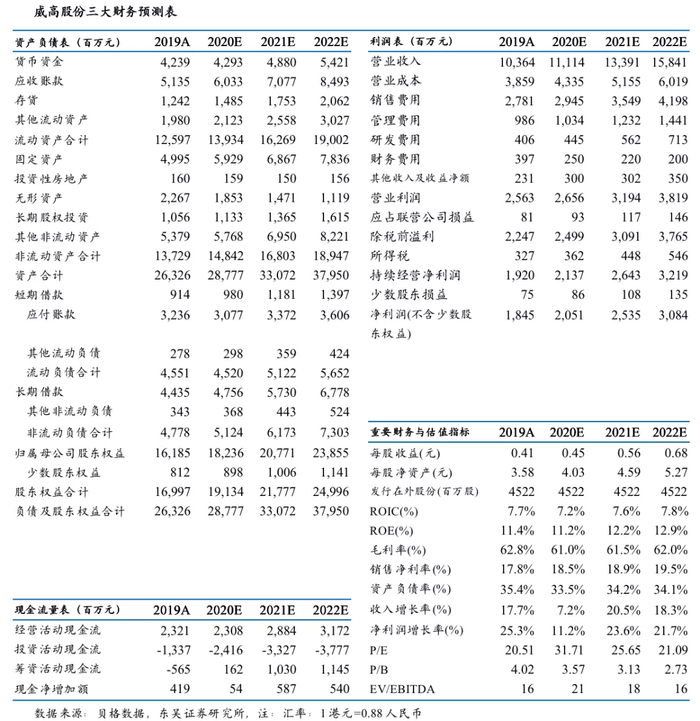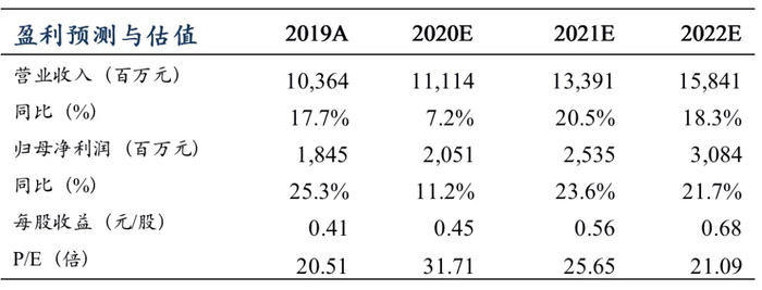 我们预计公司2020-2022年营业收入分别为111.14、133.91、158.41亿元,归母净利润分别为20.51、25.35、30.84亿元,EPS 分别为0.45、0.56、0.68元,对应 PE 分别为32、26、21倍。