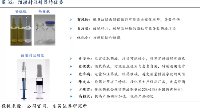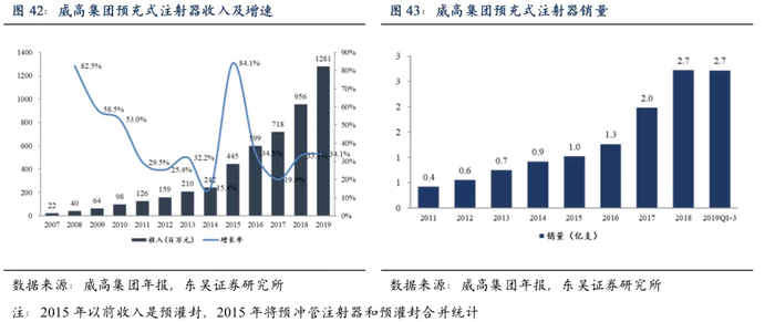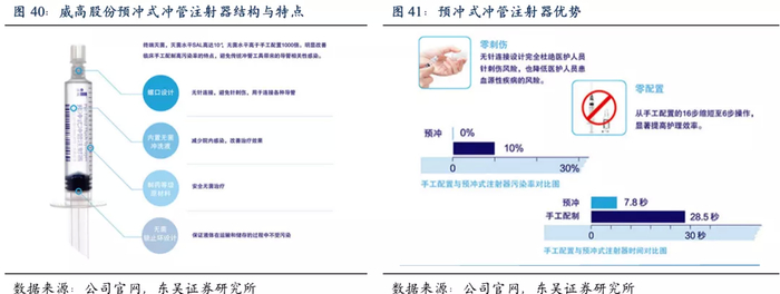 考虑到国内疫苗、生物药等企业快速崛起,威高作为国内公司,较BD医疗有一定优势,有望随着国内制药企业一起快速增长,另外生物制药企业的批次灌装、取证比较漫长,预灌封注射器需要和药品一起申报,注册后预灌封厂家和药企粘性很强,对于新进入者是一个很高的进入壁垒。