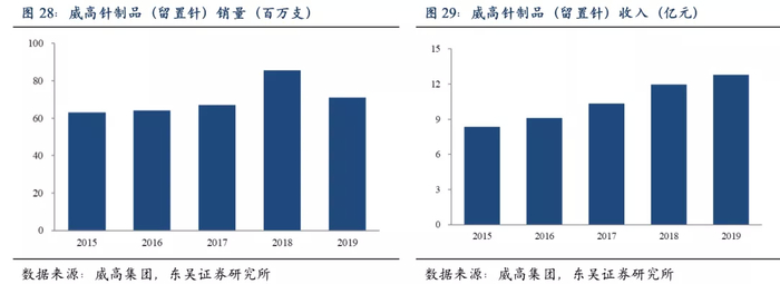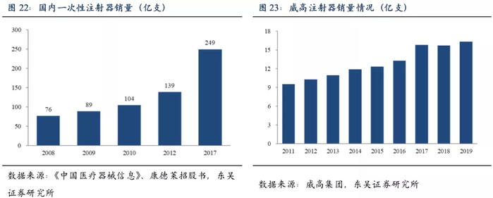 随着集采降低产品终端价,国内预充式冲管注射器渗透率有望快速提升,威高作为国内最早的预充式冲管注射器厂商,品牌和规模优势显著,有望借助集采降价实现量的高速提升,弥补价格下跌,最终实现收入持续快速增长。