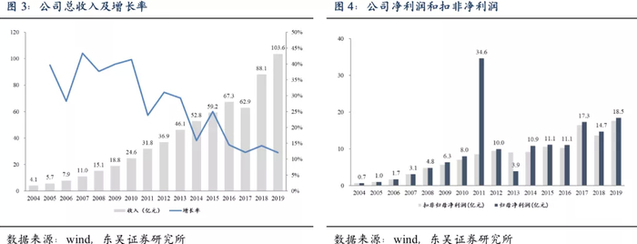 2019年公司实现营业收入103.6亿元,归母净利润和扣非净利润分别为18.5亿元和17.7亿元。2004-2019年公司收入、归母净利润和扣非净利润的年均复合增长率分别为24.1%、24.9%和24.5%。