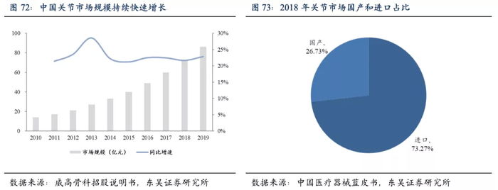 关节类作为骨科植入物中技术难度最高的细分领域,一直由外资占据主导,关节市场国产份额仅为26.73%,进口替代空间广阔。另外关节类产品主要用于关节置换手术,因此关节手术量与行业规模直接相关。按2018年中国人口计算,中国髋关节手术量每十万人只有31例,中国膝关节手术量每十万人只有19例,与欧美发达国家相差甚远。因此,我国的关节手术量还有相当大的提升潜力,预计随着中国医疗体系完善和居民健康意识的提升,未来中国关节手术渗透率将快速提升,推动关节行业规模继续快速增长。