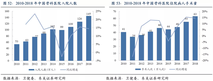 从入院人数上看,2018年骨科医院入院患者人数为145万,同比增长14.5%,连续三年增速过两位数。医师数量的增加也支撑了手术量的增长,2018年骨科医院住院病人手术次数为63.3万人次,同比增长15%。未来随着国家医疗体系的进一步建设和完善,骨科医院和医生数量有望继续增长,促进医疗需求持续释放。