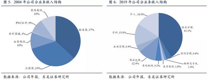 ,2004-2019年,公司收入结构从最初的几类简单耗材产品,拓展至各类高值器械与低值耗材组合。2019年,以输注类和留置针为主的临床护理耗材收入占比约41%,骨科产品、药品包装收入占比分别达到15%和12.4%,通过收购爱琅医疗,2019年介入产品收入占比达到16%。