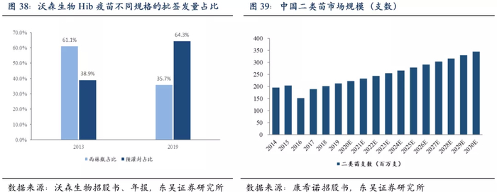 二类疫苗属于自费接种疫苗,消费属性更强,价格也更高,预灌封注射器减少药液残留,可为疫苗企业显著提高疫苗利用率。以沃森生物Hib疫苗为例,有预灌封与西林瓶两种包装规格,其中预灌封的批签发量占比从2013年的38.9%提升至2019年的64.3%。2019年中检院批签发疫苗共计5.7亿支/瓶,以50%的渗透率估计,疫苗预灌封注射器潜在使用数量达到2.4亿支。