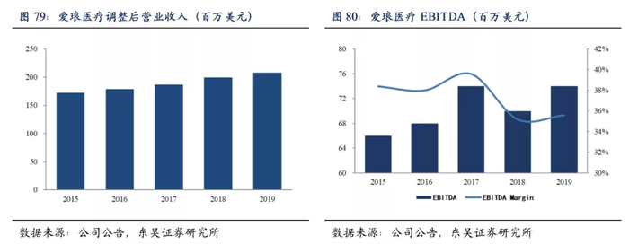 爱琅医疗营业收入过去几年呈稳健增长趋势,2019年营业收入为2.1亿美元,EBITDA为0.7亿美元,但整体净利润为负,主要系公司无形资产摊销(约2亿元)以及高借款利息所致。2019年公司完成爱琅原有高利息的银行贷款置换,爱琅财务成本显著下降,2020年净利润有望显著改善,实现扭亏为盈。
