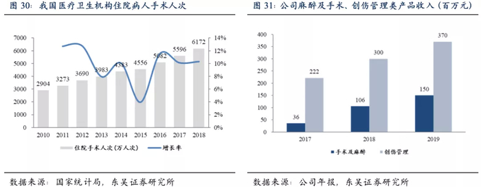 2010-2018年,我国住院手术人次整体呈上升趋势,年均复合增长率为10%,手术量的稳定增加带动麻醉耗材和创伤护理市场规模的持续增长。公司近年来持续加大麻醉耗材和创伤护理产品线的投入,2017-2019年,公司手术及麻醉和创伤管理类产品分别由0.4亿元、2.2亿元快速增长至1.5亿元和3.7亿元。考虑到公司产品线与母公司具有较大的协同性,该业务板块有望持续快速增长。