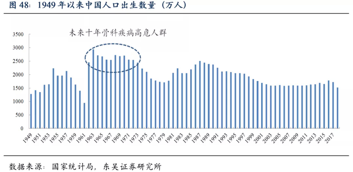考虑我国建国后出生人口数,两波婴儿潮分别开始于1962年和1981年,而1962年至1973年间出生的第一波婴儿潮人群将在未来十几年陆续迈入60岁阶段,成为骨科疾病的高发人群。预计骨科患者的患病人数将维持十年以上的高速增长趋势。